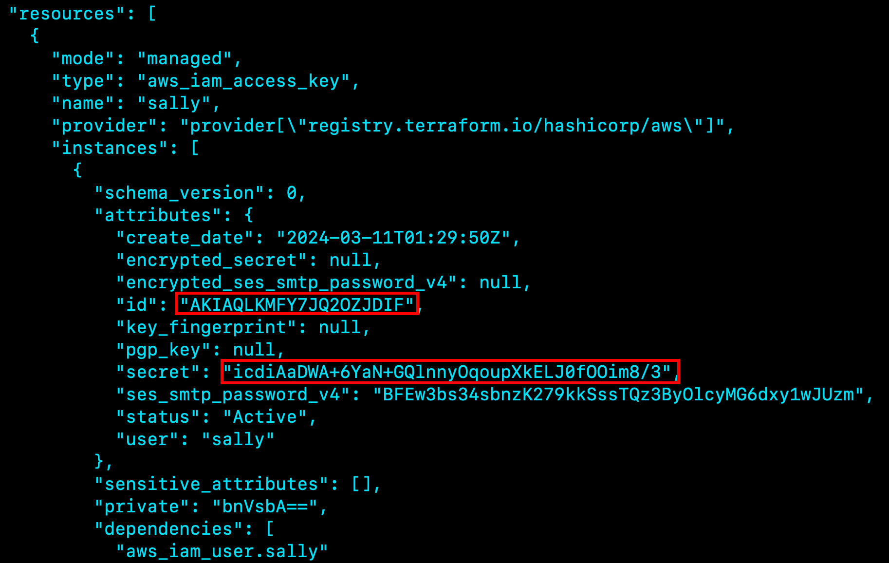 Earlier in our enumeration we identified an IAM user named sally . Let's see if their access key is stored in the terraform state file by running cat terraform.tfstate .