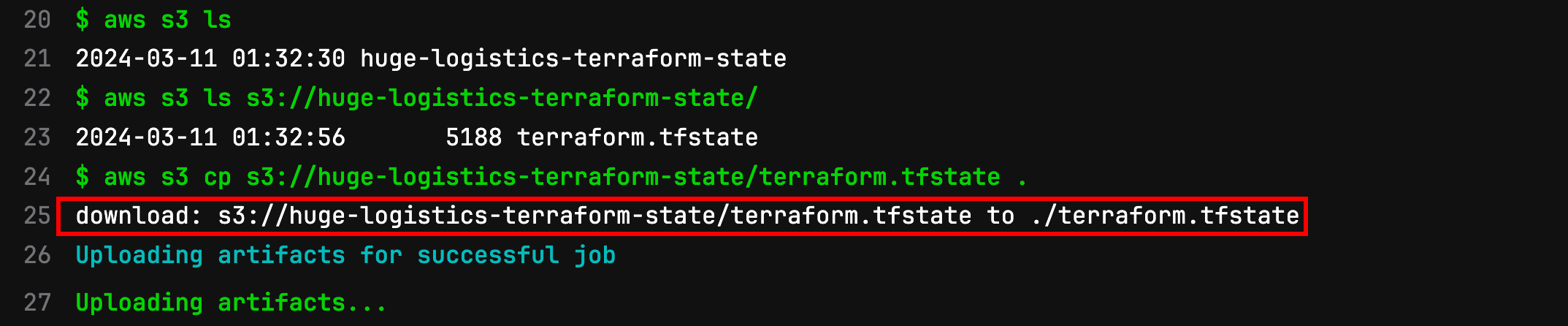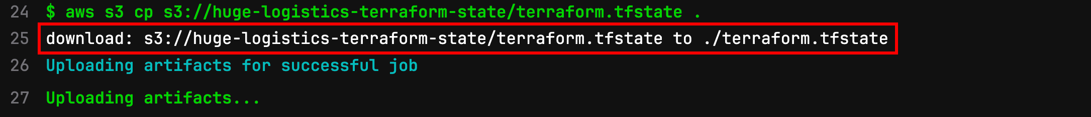We found a bucket named huge-logistics-terraform-state ! After running a few more S3 commands in the pipeline we eventually discover a terraform.tfstate file! This can be saved as an artifact and downloaded from the pipeline.