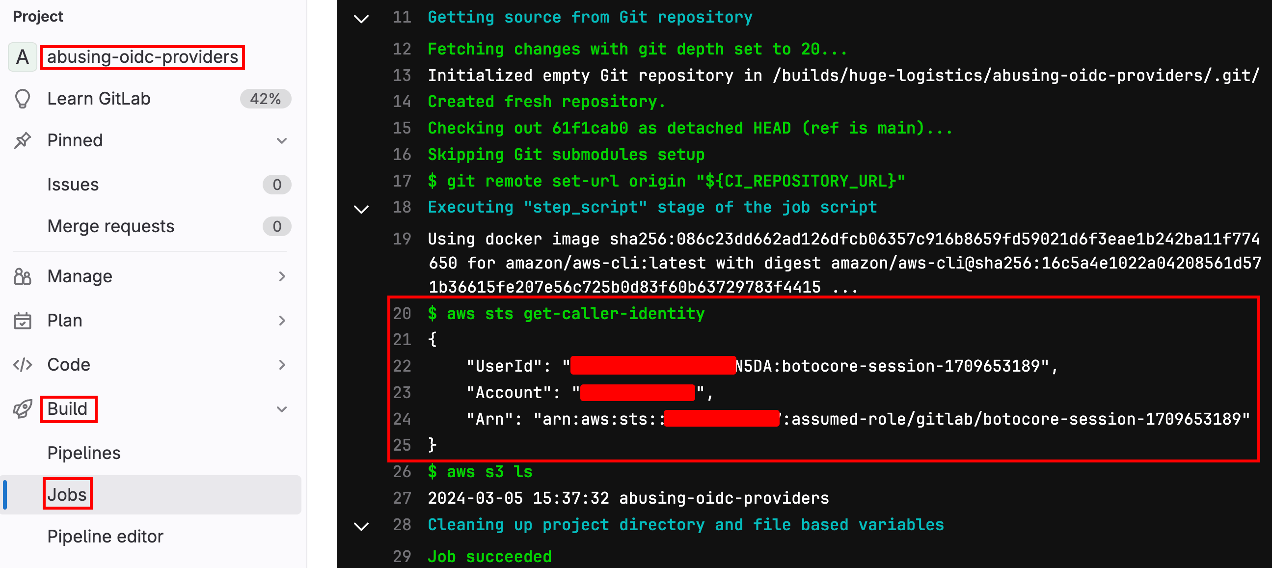 After saving this to the main branch, our GitLab CI/CD pipeline will run and we’ll confirm we have access to the gitlab IAM Role!