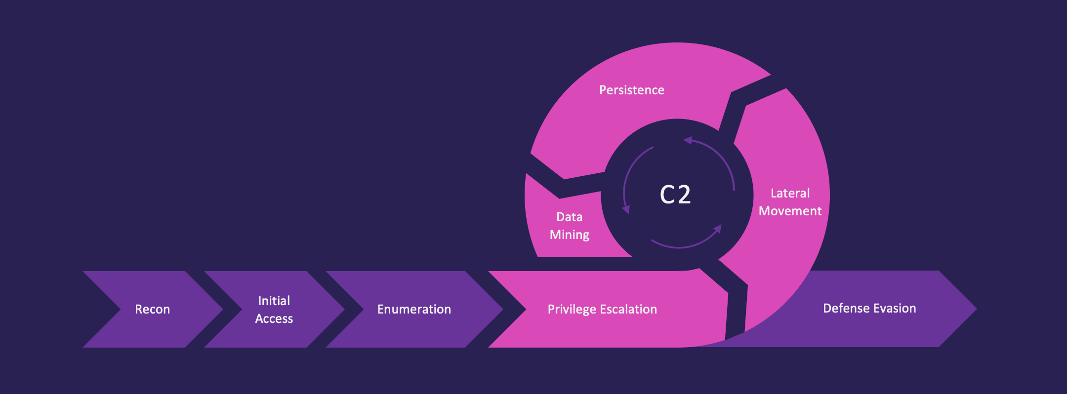 In Azure, privilege escalation refers to the process where a threat actor gains permissions within an Azure environment, e.g. at the level of an Azure subscription, Entra ID tenant, or Resource Group, which is more privileged than those originally assigned to the compromised identity. This can involve exploiting misconfigurations, improper permissions, or weaknesses in identity management and access controls. To increase access in the cloud, we're required to undertake a continuous cycle of enumeration, lateral movement, persistence and privilege escalation.
