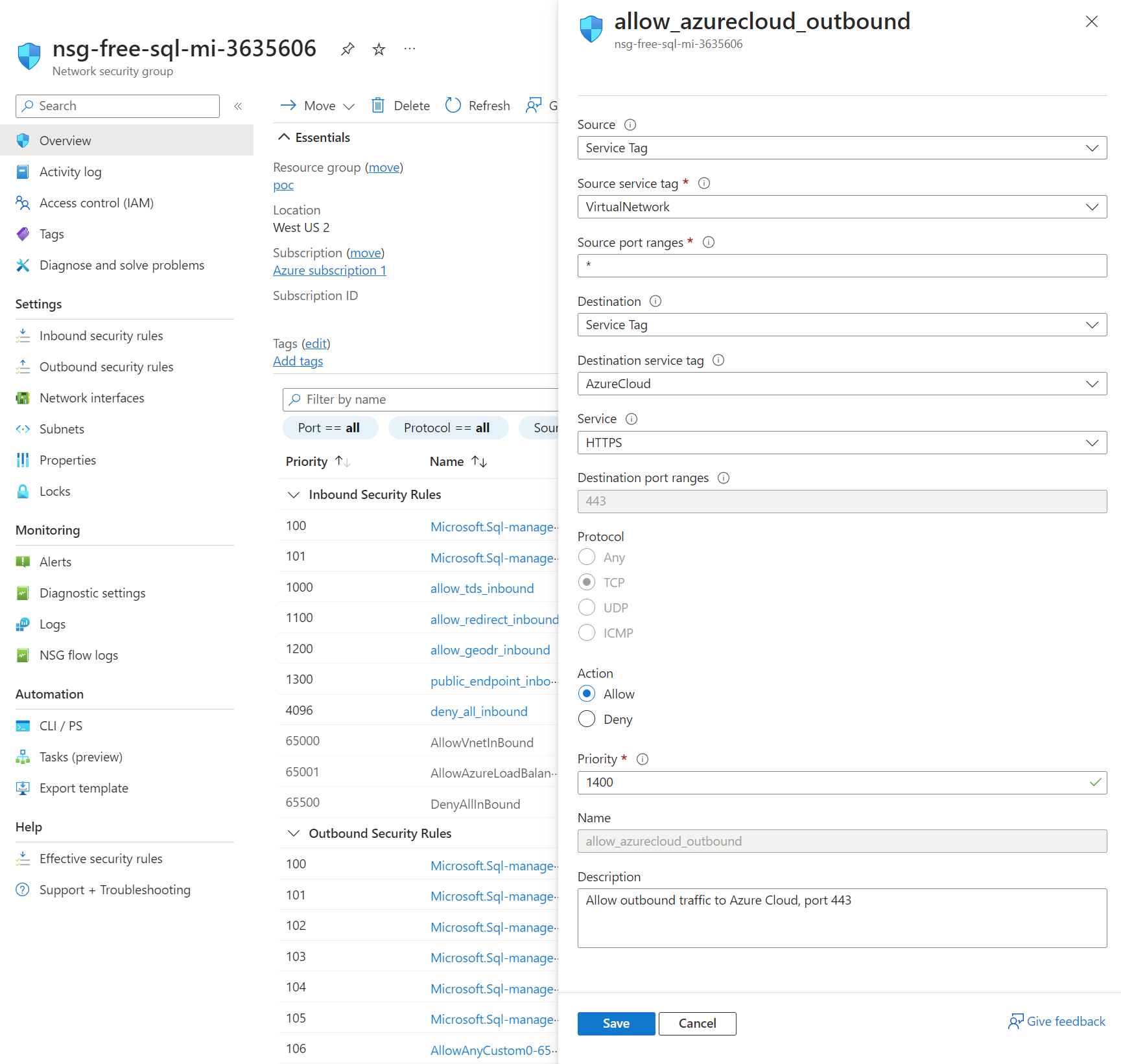 By default, Azure SQL Managed Instance doesn't have outbound access to the internet (although Azure SQL Server does). However, as we might expect for a managed resource that is part of the Azure PaaS, it's able to access the Azure Cloud. The AzureCloud service tag specified as a destination includes a very large number of Azure IP addresses.