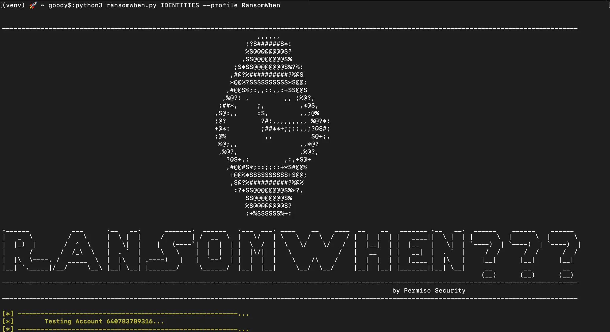 # This command identifies the AWS principals with exploitable permissions$ python3 ransomwhen.py IDENTITIES --profile RansomWhen