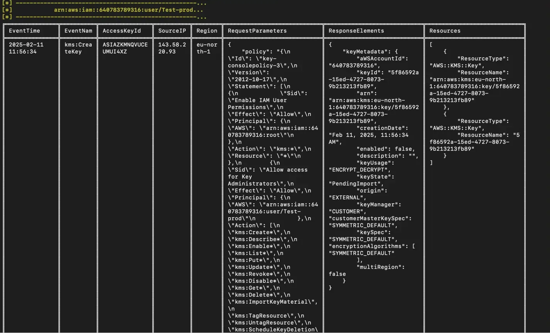 The RansomWhen output reveals that the potentially compromised user Test-prod issued a kms:CreateKey request 😱